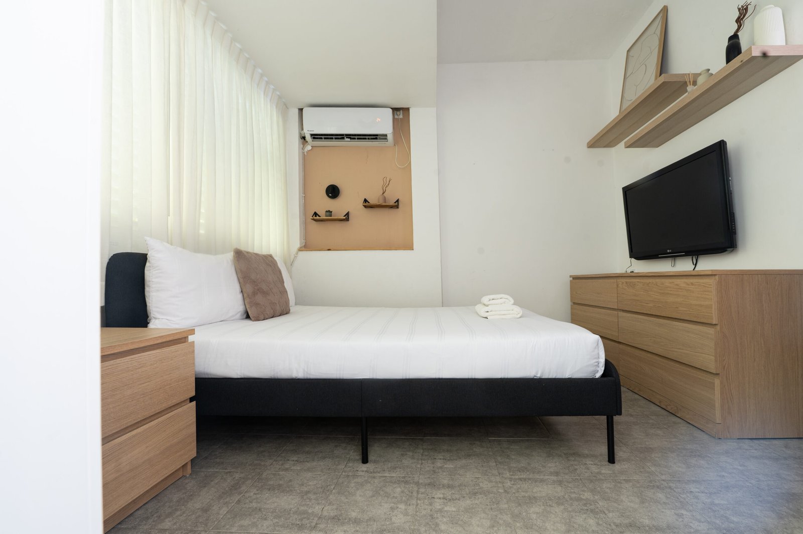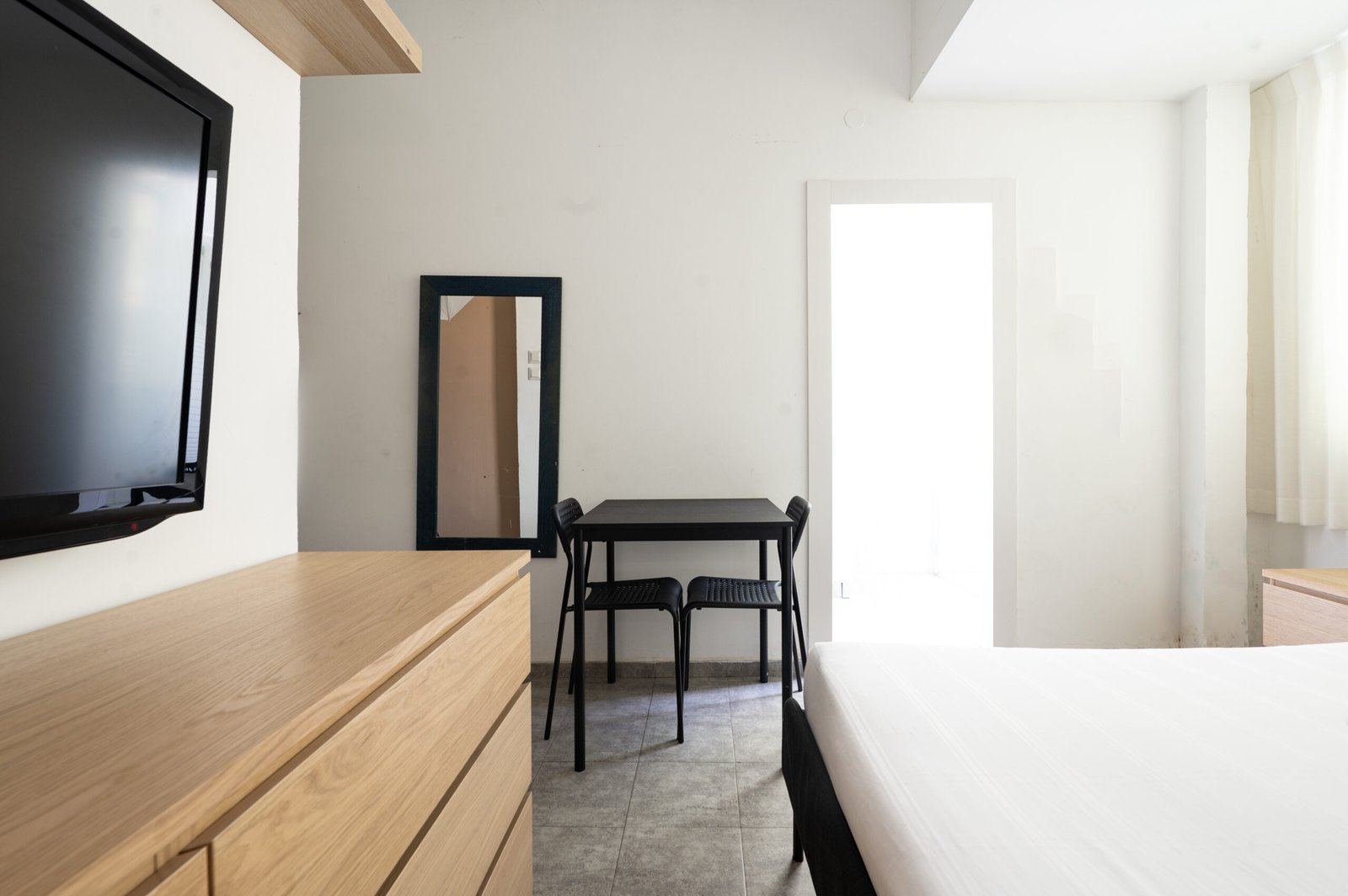 Living room: Linens, Wardrobe or closet, Desk, Flat-screen TV, Socket near the bed, Iron, Clothes rack, Tile/Marble floor.