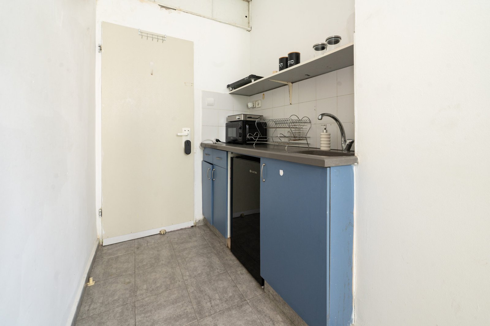 Kitchenette: Cleaning products, Coffee machine, Electric kettle, Oven, Refrigerator, Stovetop.
